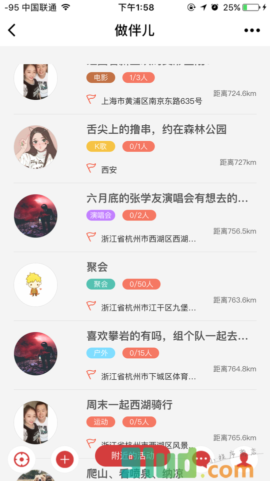朋友虽好,但是也不能时时刻刻围着你绕。 当朋友们都不能陪你的时候,试试用【做伴儿】小程序,打开或许有惊喜哦! 【做伴儿】小程序是基于地理位置的社交工具,可以发现附近新奇有趣的活动,并可以和兴趣相投的人一起参加活动。