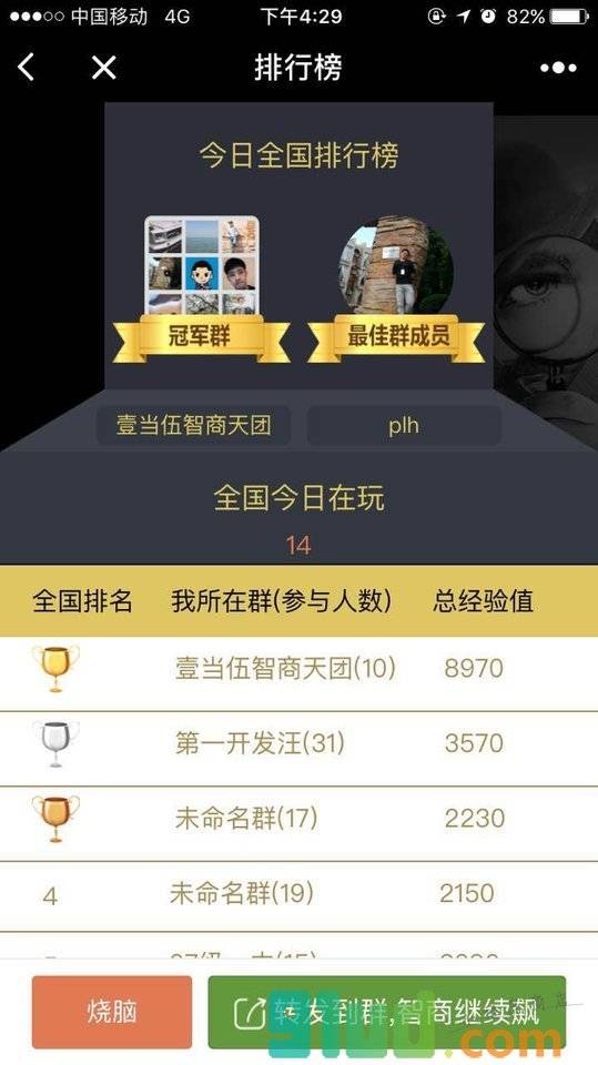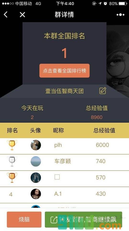 群里有侦探是一款基于微信群推广的推理类小程序,收集了大量的烧脑题目进行挑战,并可以分享到微信群,查看群内排名、全国排名。极大提高了微信群内的活跃度。