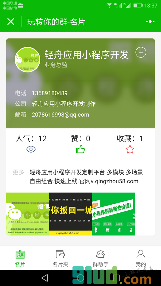 玩转你的群,让你在微信群中与众不同。玩转你的群小程序可制作电子名片,可发布群通知、群活动、群打卡、群投票等。使用轻舟应用的名片模块和超级群助手模块做成。
