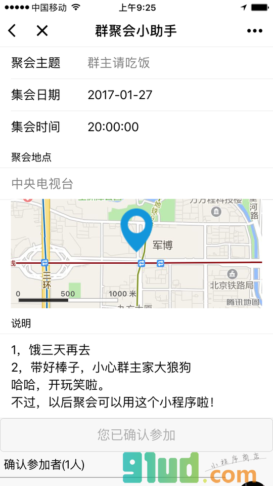 组织聚会,很easy:1.自动统计聚会人员;2.聚会信息一目了然;3.地图显示聚会地点;4.一键导航轻松到达。小助手,助你高效聚会