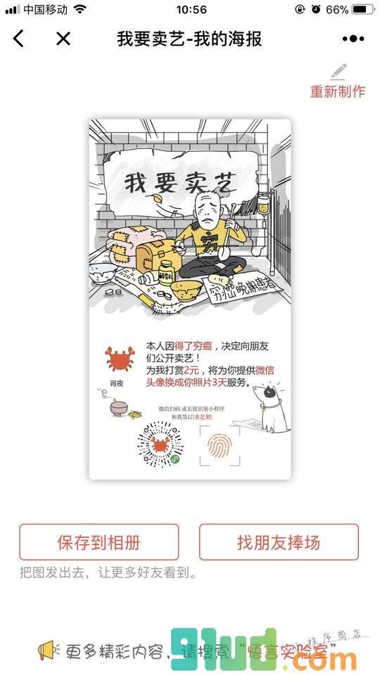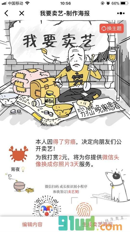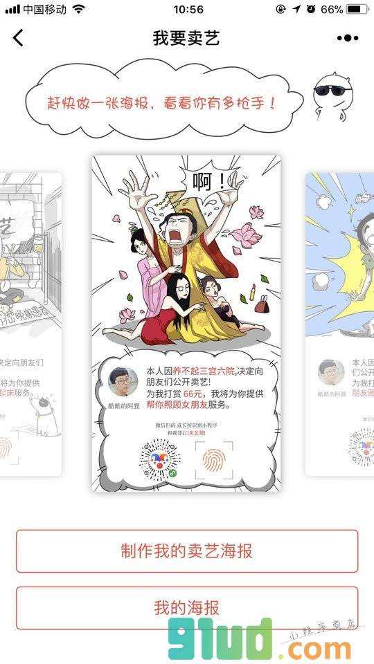 我要卖艺是一款海报制作工具,你可以生成又去的卖艺海报,接受好友打赏。