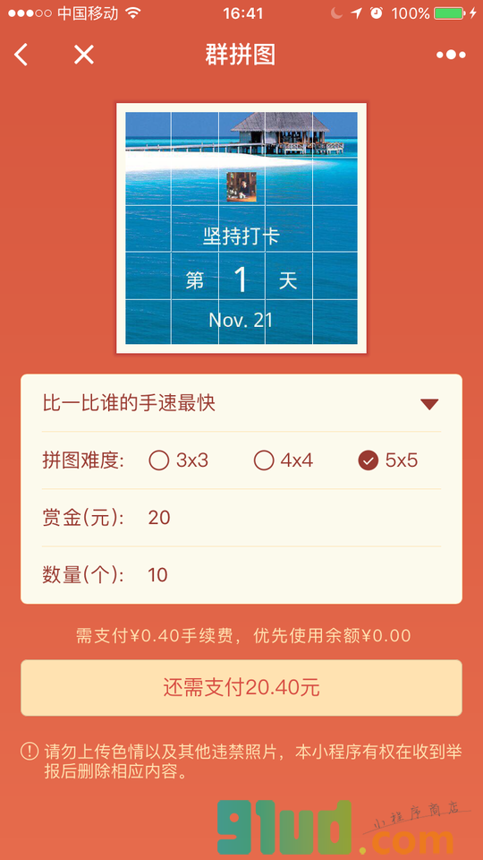 活跃气氛、休闲娱乐、节日祝福的拼图小程序。在发拼图PK时可以设置领取奖励的拼图,好友必须拼对图能领到奖励。恶搞、示爱、挑逗、甚至是公司logo...发挥你的想像力,这个小程序比你想像的还要好玩。抢到赏金可以马上提现,还是秒到帐哦~#拼图红包#