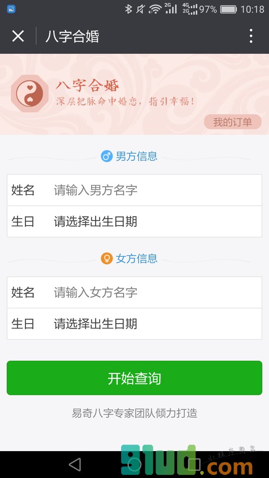 - 在微信中搜索“八字合婚姻缘配对婚恋交友指南”即可进入小程序