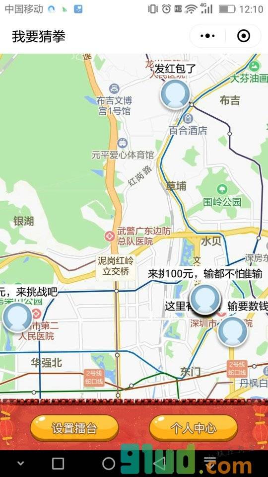 在地图显示猜拳擂台,每个人都可以参与,调整擂主,赢,就可以获得红包输了,就得随机输0.01~1给擂台主。每个人都可以参与。提现秒到用户钱包