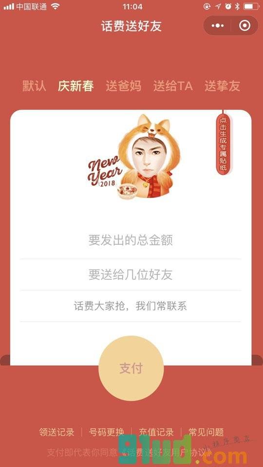 - 使用微信扫描页面上方二维码进入话费送好友