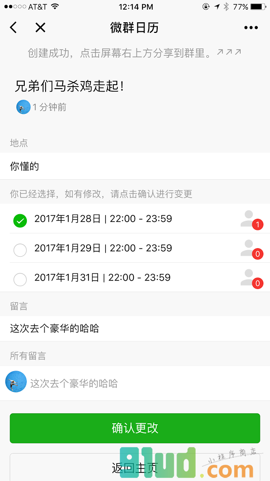 微信共享日历。私密日历只有指定成员可见,公开日历则能被别人发现。微信群约饭约活动的神器,特别是微约的功能。
